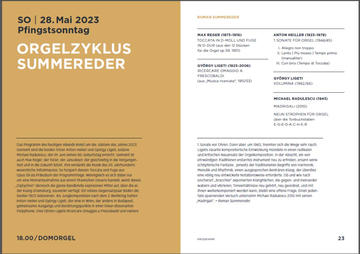 und in die Zukunft blickt. Ihm verdankt die Musik des 20. Jahrhunderts wesentliche Initialimpulse. So fungiert dessen Toccata und Fuge aus Opus 59 als Präludium der Programmfolge. Wenn gleich es sich dabei nur um eine Momentaufnahme aus einem titanischen Oeuvre handelt, weist dieses „Diptychon“ dennoch die ganze Bandbreite expressiver Mittel auf, über die er, der Klang-Dramaturg, souverän verfügt. Ein vitales Gegensatzpaar bilden die beiden 1923 Geborenen. Als Jungkomponisten nach dem 2. Weltkrieg hatten Anton Heiller und György Ligeti, der eine in Wien, der andere in Budapest, gemeinsame Ausgangs und Berührungspunkte in einer linear-dissonanten Polyphonie. Dies führen Ligetis Ricercare Omaggio a Frescobaldi und Heillers 1. Sonate vor Ohren. Dann aber, um 1960, trennten sich die Wege sehr rasch. Ligetis rasante kompositorische Entwicklung mündete in einen radikalen und kritischen Neuansatz der Orgelkomposition. In der Absicht, ein von sehr würdigen Traditionen erstarrtes Instrument neu zu erfinden, ersann seine schöpferische Fantasie, jenseits der traditionellen Begriffe von Harmonik, Melodik und Rhythmik, einen ausgesprochen konträren Klang, der überdies eine völlig neu entwickelte Notationsweise erforderte. Ob und wie nach solcherart „bracchial“ exponierten Klangflächen, die gegen- und ineinander wabern und vibrieren, Tonverhältnisse neu gehört, neu geordnet, und mit ihnen weiterkomponiert werden kann, bleibt eine offene Frage. Einen jedenfalls spannenden Versuch unternahm Michael Radulescu 2010 mit seinen „Madrigali“. RS